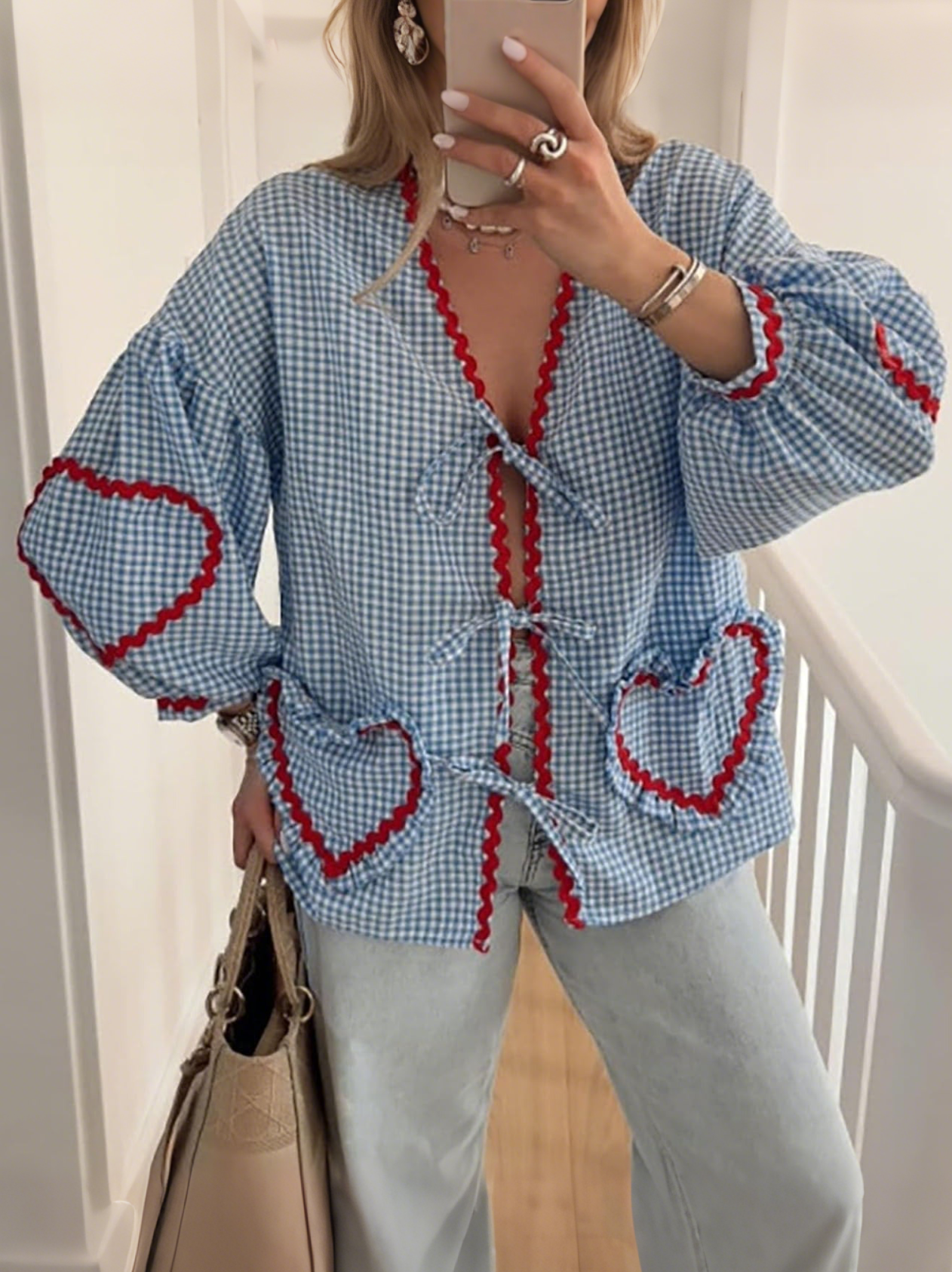 ?Break the rules of sweet style with this darling gingham heart blouse?acomplete with tie-front, puff sleeves, and wave-trimmed heart pockets. Pair with jeans for an effortless, chic look. Available in bold hues, softness guaranteed.