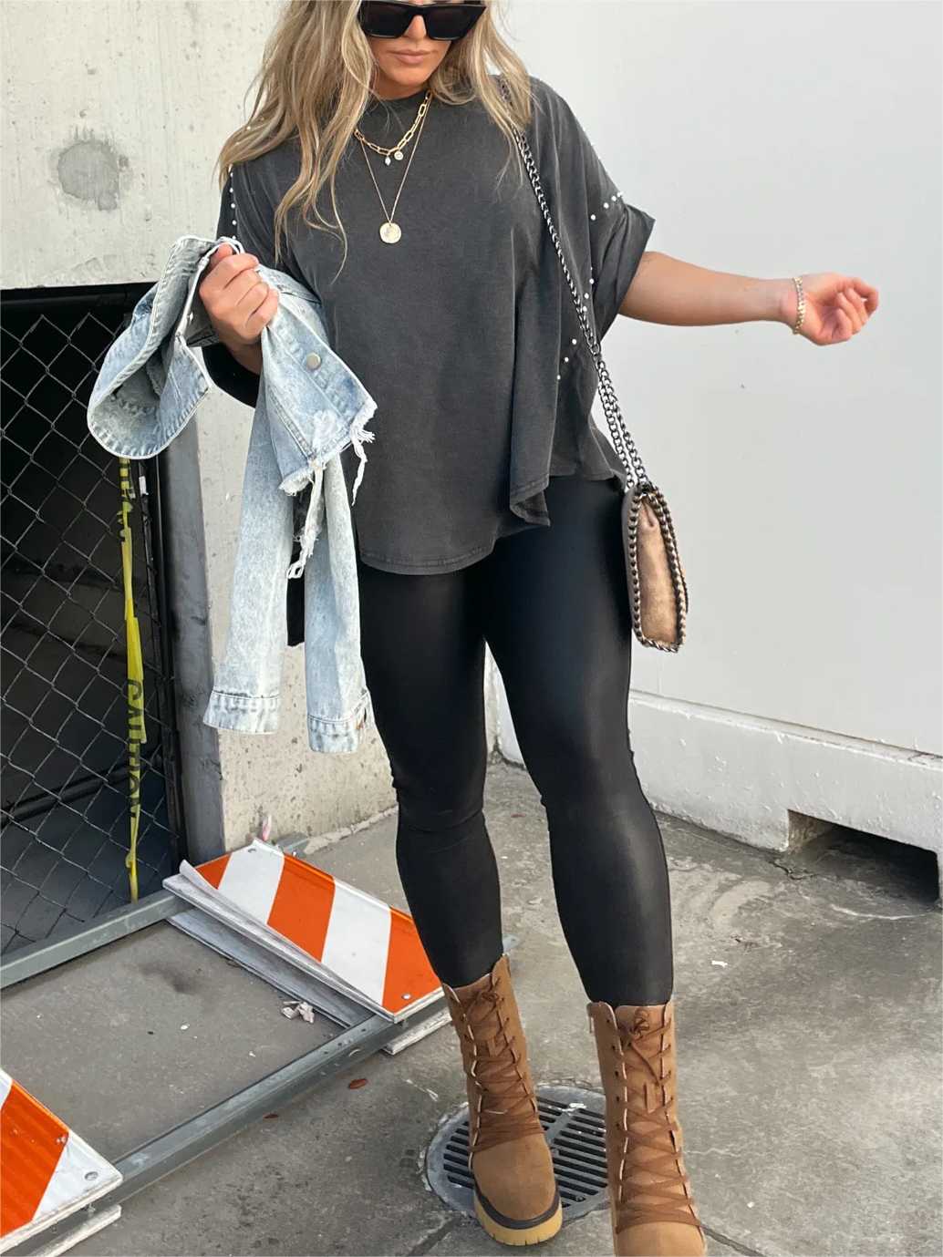 Add a little edge to your wardrobe with this oversized tee featuring stud details and a high-low hem. Easily dress it up with a pair of leather leggings or distressed skinny jeans + a chunky boot!